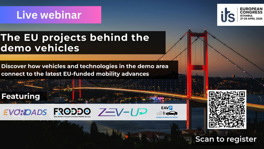 On Monday, 27 April, from 12:00-13:00, the projects EvoRoads, FRODDO and ZEV-UP, together with the ERTICO Platform EAVP, will host a complimentary webinar showcasing their work in mobility, road safety and green energy. The event will be showcased live from the ITS demo area, but will be accessible to all.