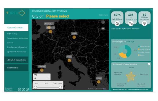 The dynamic map is a gateway to understanding the diverse BRT systems implemented across the demo cities. It facilitates an in-depth analysis by offering dedicated pages for each characteristic considered in the scorecard, including: