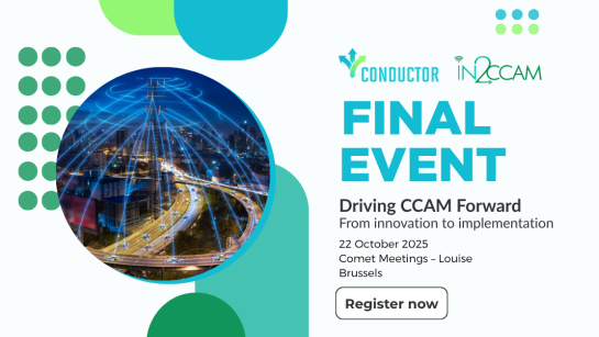 Taking place on 22 October at Comet Louise in Brussels, the event will be a showcase of the projects’ findings as well as a space for open dialogue on relevant and still pressing topics for CCAM, including interoperability, societal acceptance, and the vital role of data. Beyond the panel discussions, the event will feature a roll-up area for new projects as well as networking opportunities. With this, IN2CCAM and CONDUCTOR lay the foundations for their legacy, sharing results that facilitate further deployment.